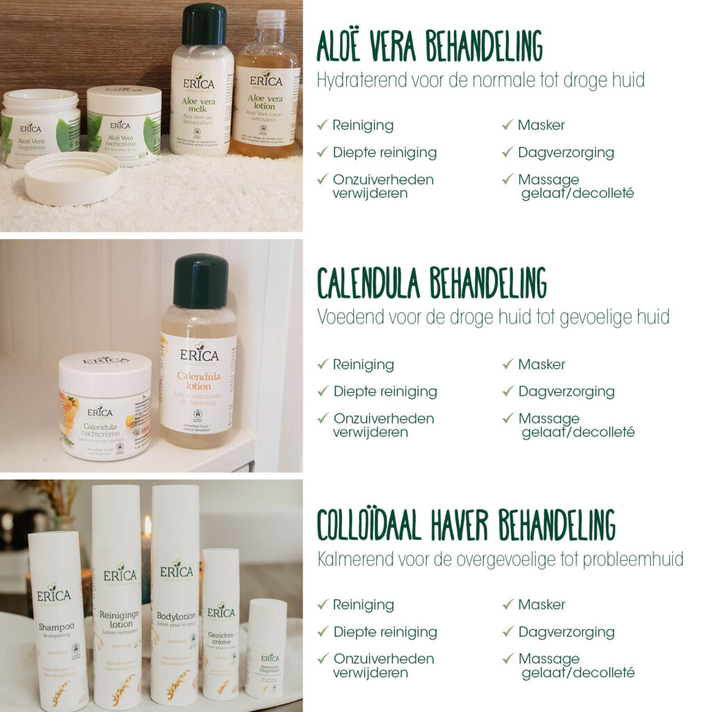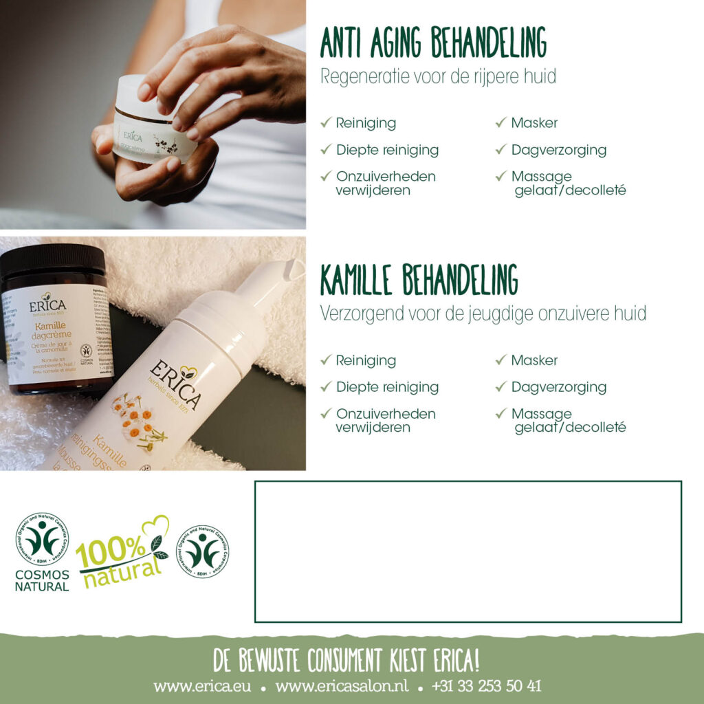 Erica is een Nederlands merk dat is genoemd naar het kruid “Erica”. Het bestaat sinds 1973 en staat voor natuurzuivere producten die Cosmos Natural gecertificeerd zijn. Dit keurmerk staat garant dat de producten onder de natuurcosmetica vallen en absoluut dierproefvrij zijn. Verder worden er geen synthetische kleur- of geurstoffen, siliconen, parafine of aardolieproducten toegepast omdat dat de huid geen goed doet. Helaas worden deze ingrediënten nog te vaak gebruikt, ook bij duurdere merken.